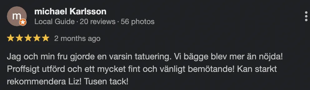 Välkommen till min tatueringsstudio - en av de äldsta i Malmö. Mitt namn är Lis och jag är kvinnlig tatuerare och piercare på Liz Tattoo & Piercing. Jag har varit verksam inom professionell tatuering och piercingkonst